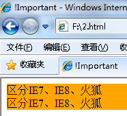 1 2 3 4 5 6 7 8 9 10 11 12 13 14 15 | <!DOCTYPE HTML> <html> <head> <meta http-equiv="Content-Type" content="text/html; charset=utf-8"> <title>!Important</title> </head> <body> <div style="background:orange;*background:green !important;*background:blue;"> 区分IE7、IE8、火狐 </div> <div style="background:orange;*background:green;_background:blue;"> 区分IE7、IE8、火狐 </div> </body> </html> |