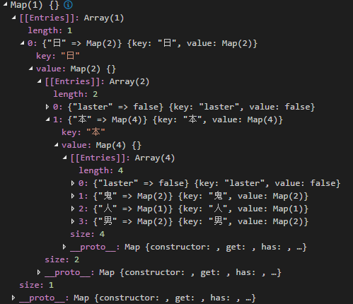 每个文字是一个节点,连续的节点组成一个词, 日本人 对应的就是中间的那条链,我们可以使用对象或者map来构建树,这里的栗子采用 map 构建节点,每个节点中有个状态标识,用来表示当前节点是不是最后一个,每条链路必须要有个终点节点,先来看下构建节点的流程图
